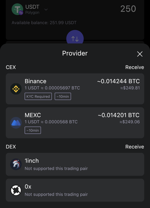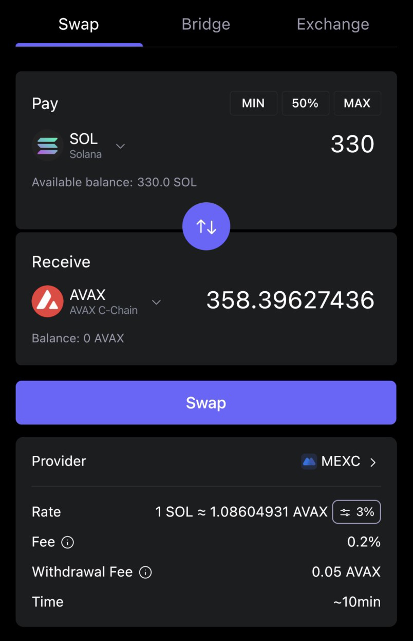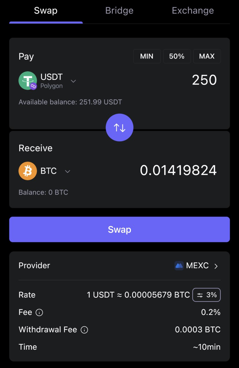 همانطور که در تصویر بالا مشخص است، میتوان با ارسال کوین سولانا SOL، کوین آوالانچ AVAX دریافت کرد. یا با ارسال توکن تتر پالیگان، بیتکوین دریافت نمود.
