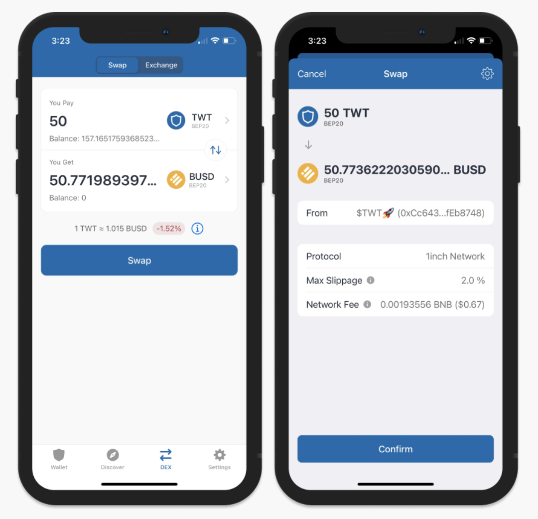با زدن روی گزینه Swap به صفحه بعد (شکل سمت راست) میرویم. در این صفحه خلاصهای از سوآپ را خواهیم دید. اگر کارمزد شبکه (Network Fee) و حداکثر لغزش (Max Slippage) برایمان جذاب بود روی دکمه تایید (Confirm) میزنیم تا این مبادله و سواپ انجام گردد. در صورت موفقیت، 50TWT از توکنهای TWT که داشتیم کسر و حدوداً 50.77BUSD به موجودی BUSD ولت اضافه خواهد شد (شکل سمت راست).